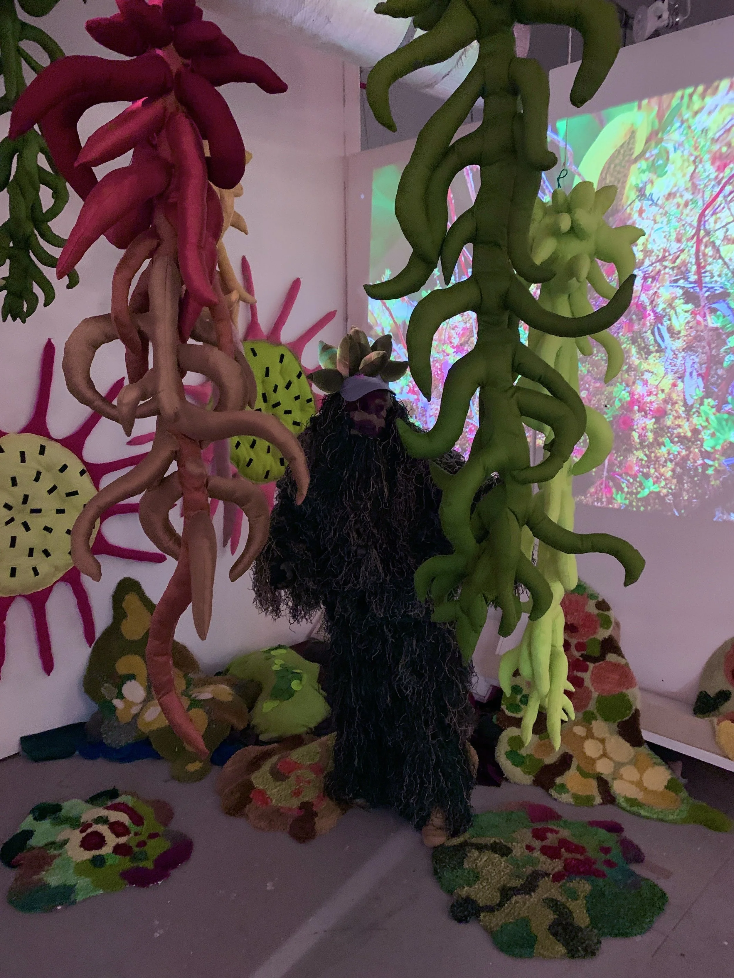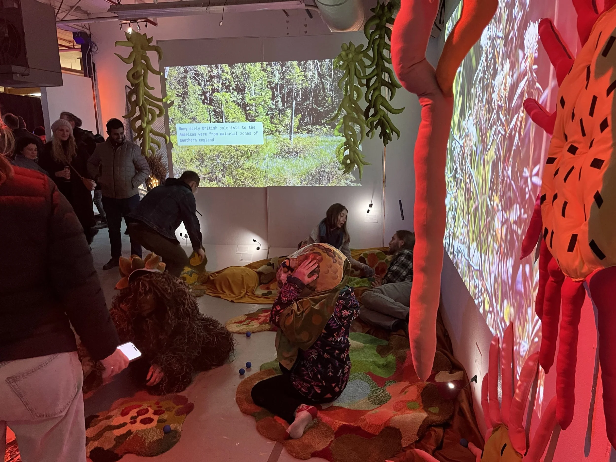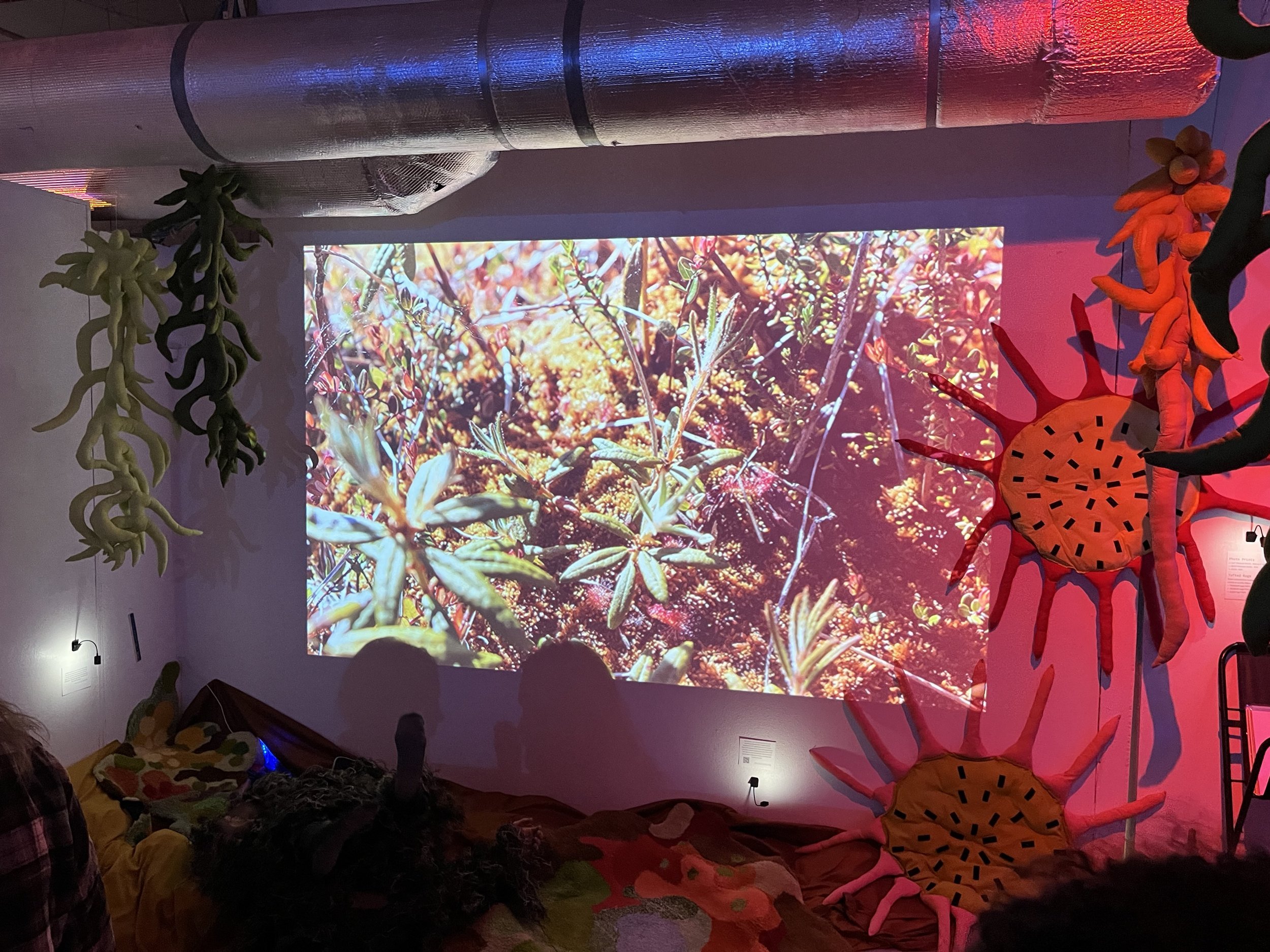My current project is a multimedia installation that invites viewers inside a peat bog, engages the senses, and encourages people to slow down, look closely, and maybe, experience perspective shift. I’m compelled by questions about how we make relationship with the living world, and how land is valued. I respond to these beautiful, lively, ancient ecosystems full of tiny beings by playing with scale: creating human sized soft mosses, and projecting macro photography onto the wall. I share my research and invite participants to become the beings in the bog through embodied play.