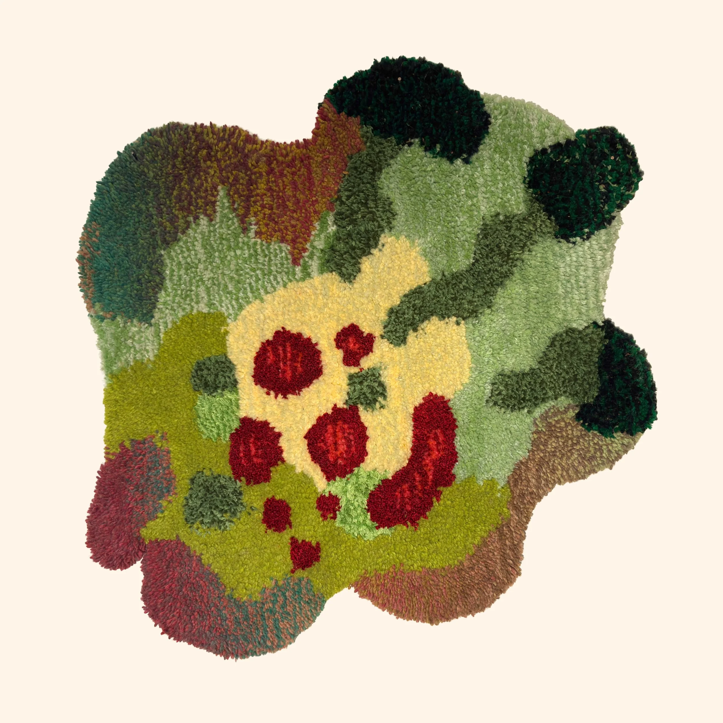 Hand tufted textile, wool, cotton, and synthetic fibers.